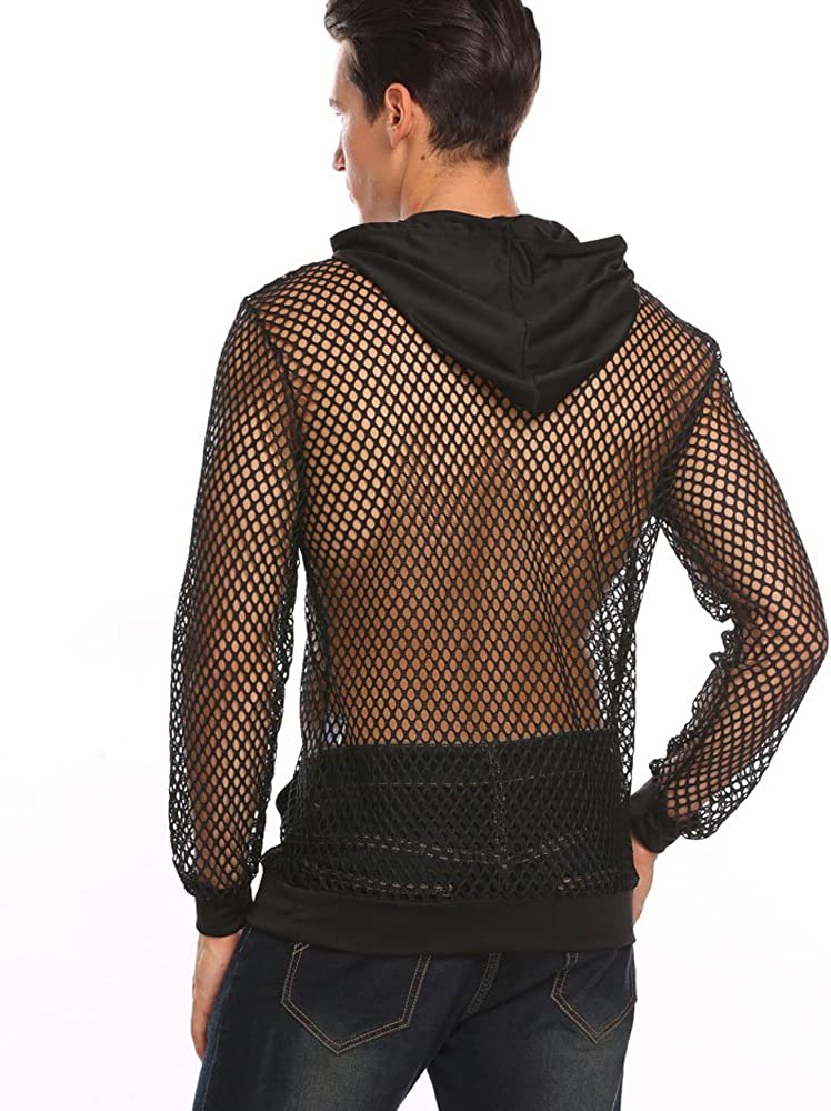 - DESIGN: Fishnet mesh design help you show your healthy muscle, to make you more attractive, and make your skin more breathable when sleeping; See through shirt with hoodie adds sport and casual style; a front pocket to store your self things