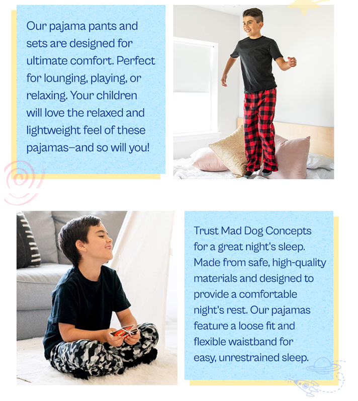 • Boys Lounge Pants: The perfect gift for the little one in your life. These big boys' PJ pants are designed to make sleeping easier than ever before. With an elastic waistband that allows you plenty of room when it's time hit snooze again!