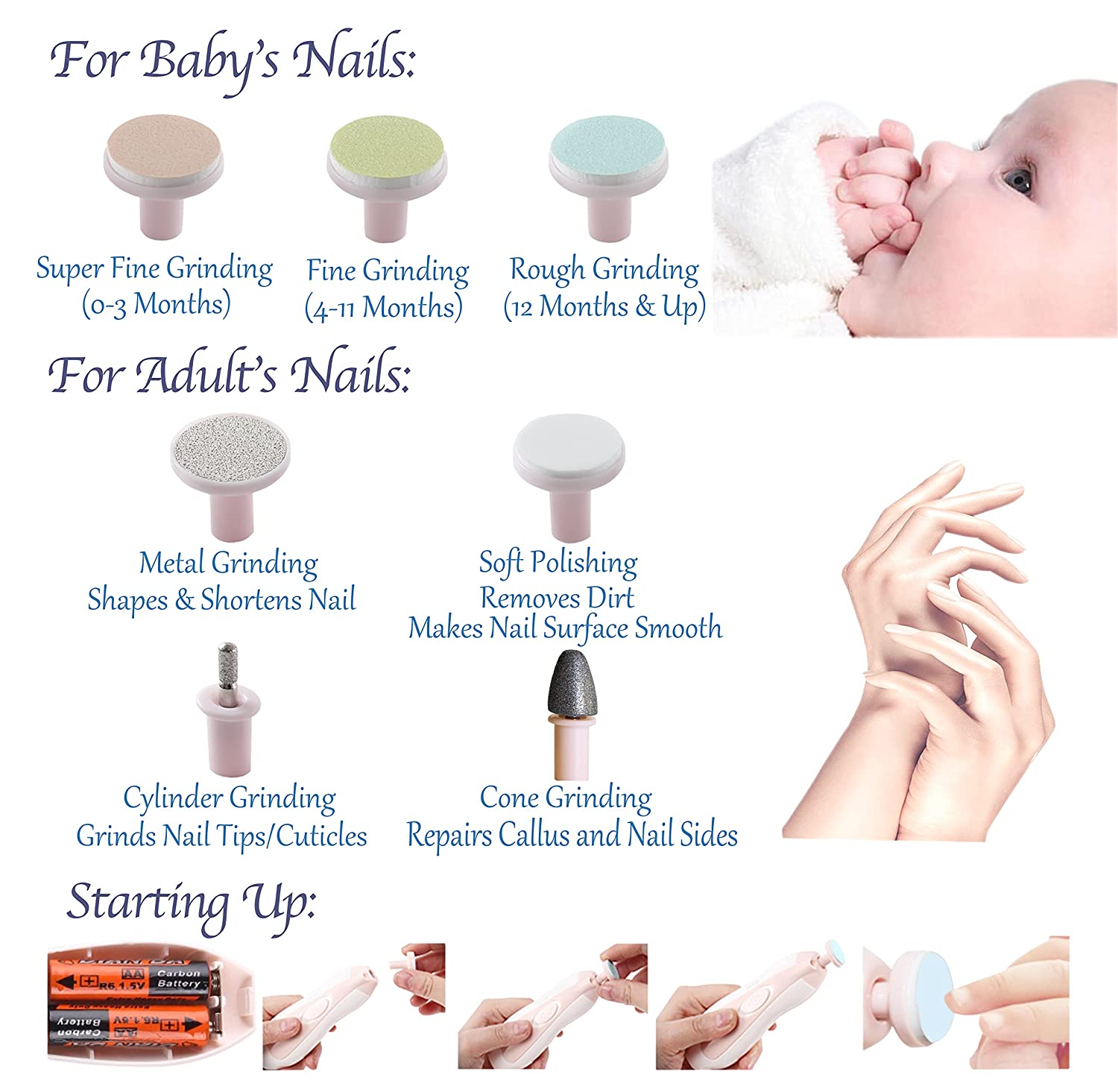 ✅20 in 1 VALUE SET: Each set comes with 6 cushioned sandpapers file attachments for baby's nails, and 4 file attachments for adult's nails. BONUS: 8 EXTRA replacement emery file pads!! You will NEVER NEED TO BUY replacement sandpaper/file!!