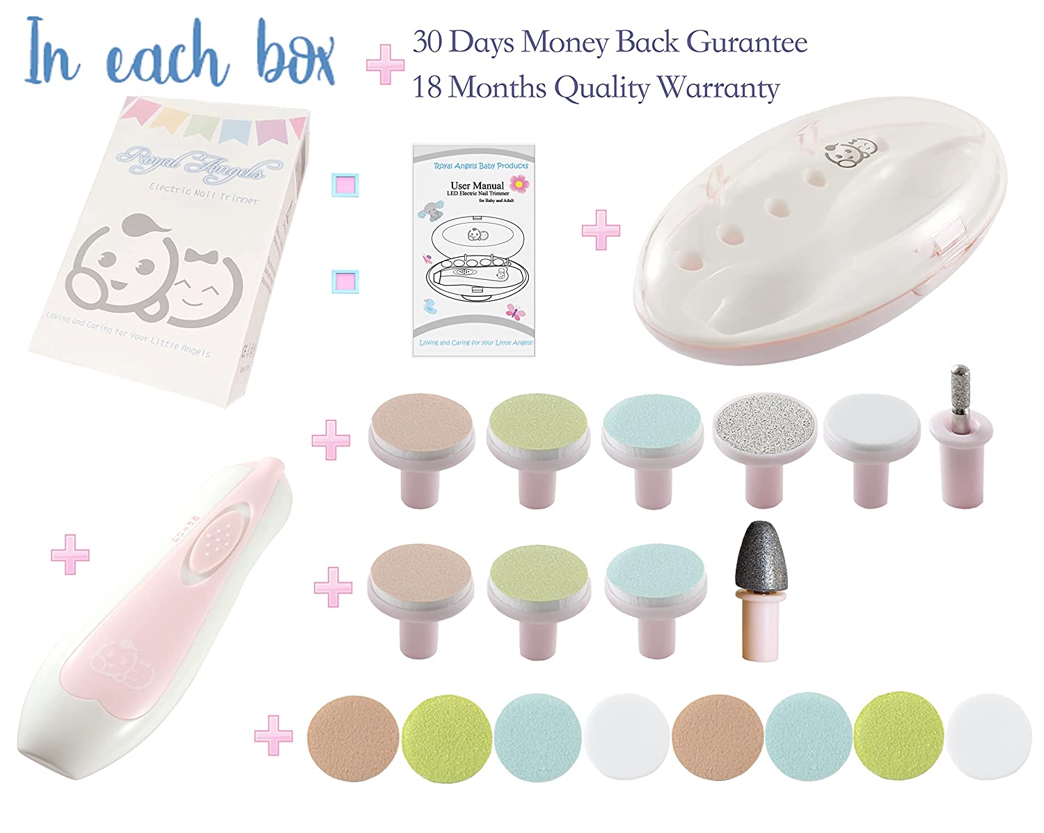 Baby Nail Clippers 20 in 1 by Royal Angels Baby | Safe Electric Baby Nail Trimmer, Baby Nail File Kit, Additional Replacement Heads, Newborn Toddler Toes and Fingernails, Trim and Polish (Blue)