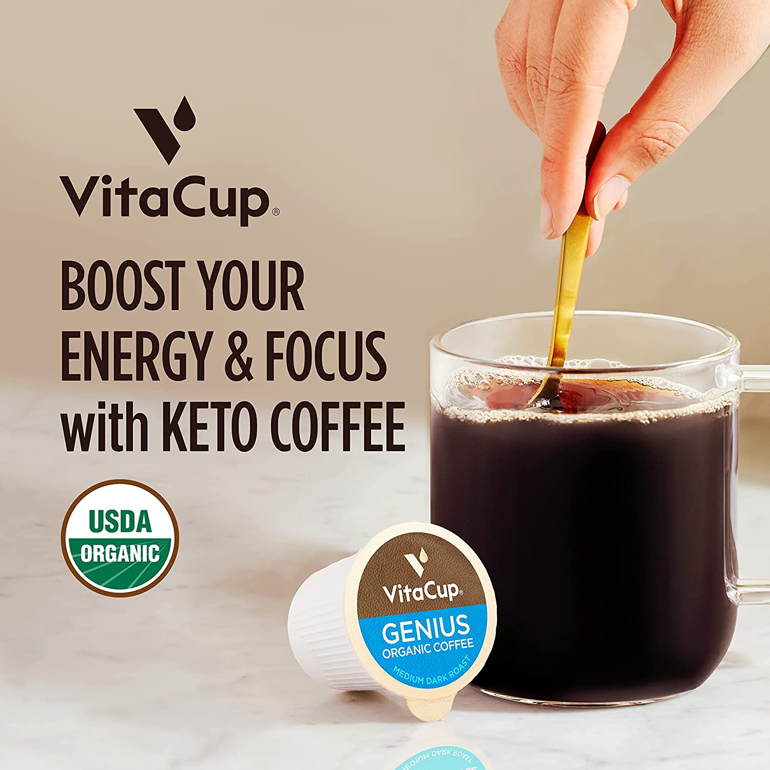 VitaCup Genius Keto Coffee Pods, Increase Energy & Focus with MCT Oil, Turmeric, B Vitamins, D3, Medium Dark Roast, Bold, Smooth, Recyclable Single Serve Pod Compatible with Keurig K-Cup Brewers,1