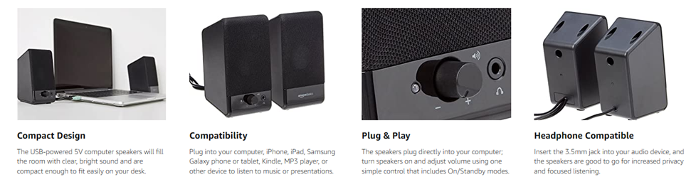 Amazon Basics Computer Speakers for Desktop or Laptop PC | USB-Powered, Black
