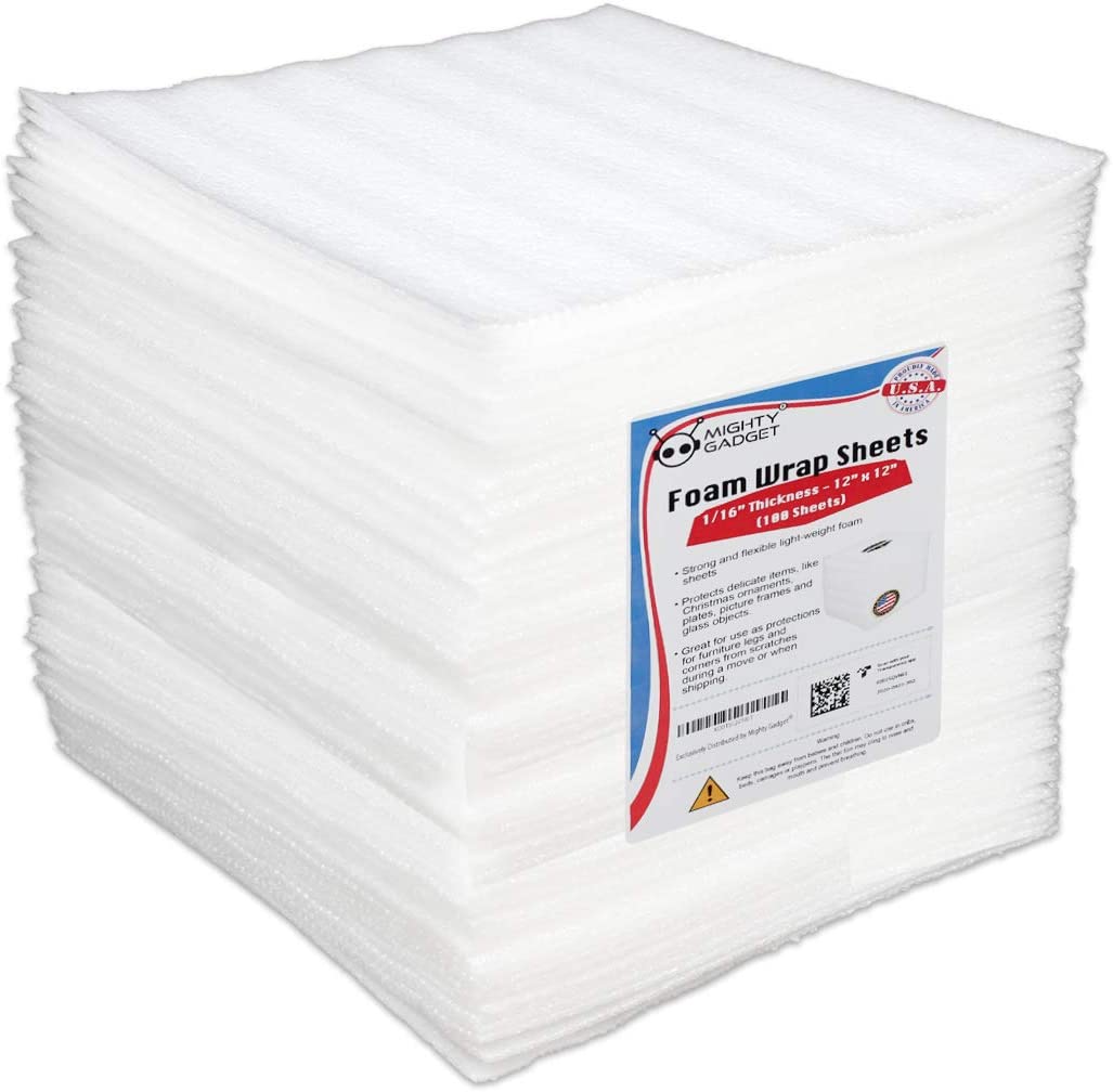 You will receive 100 sheets of Mighty Gadget brand package cushioning foam sheets moving and storage supplies - Dimensions: 12x12 inch with 1/16 inch thickness. Buy them once and they can be reused over and over again. 12 x 12 x 1/16" thickness