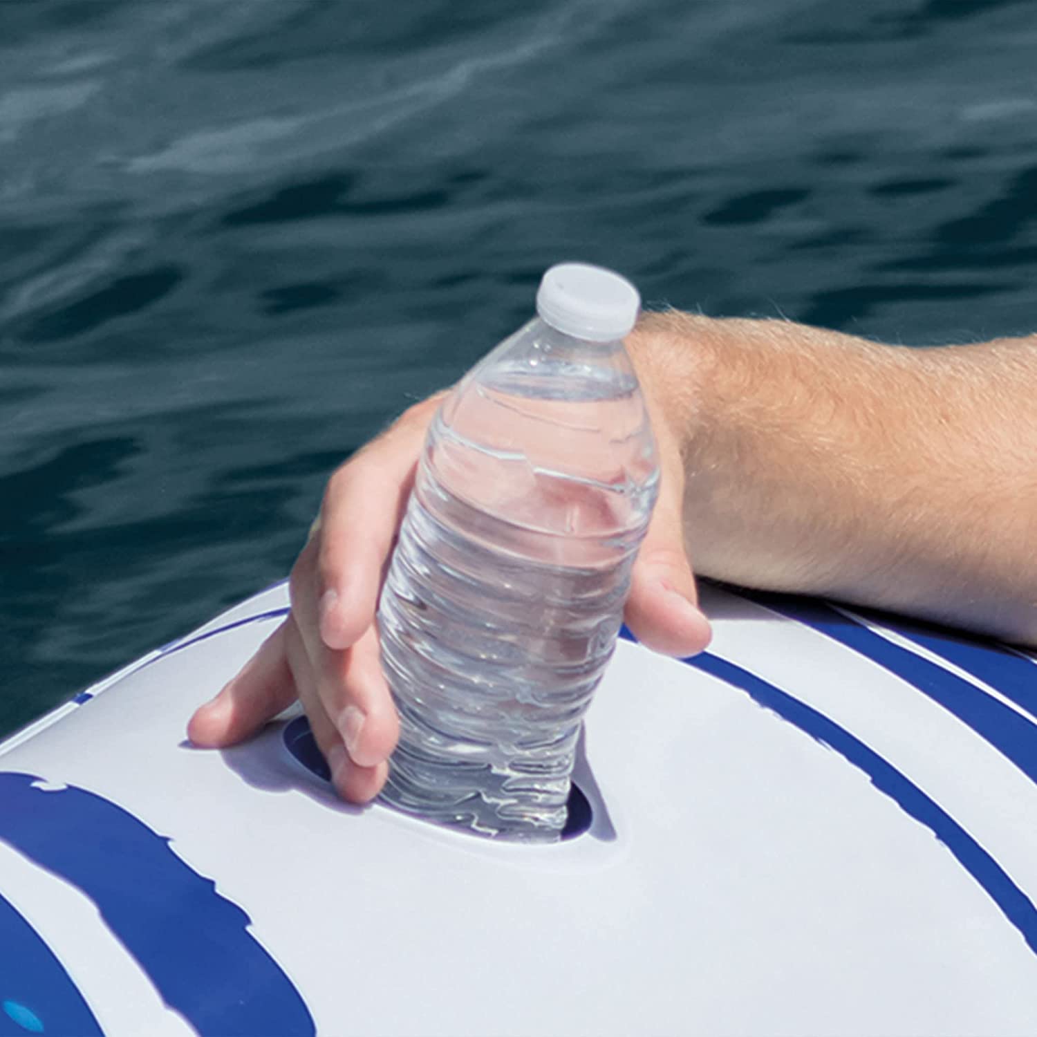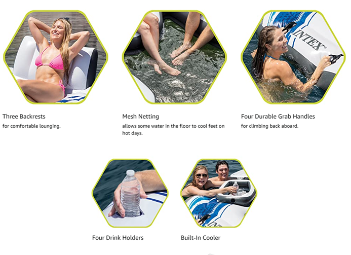 Load up your friends and family and relax on the water with the Blue Tropic Inflatable Water Float from Intex. Your pals will love cracking open a few cold drinks on this raft as you ride the waves of the water. With 4 cup holders and a built-in cooler, you can keep your favorite beverage within reach while the others stay extra chill. Even on the hottest summer days, you're able to remain cool with the mesh floor netting. Featuring 3 backrests, this raft provides maximum comfort as you float in the lake or swimming pool. Quickly inflate the float and be on the water in no time. The heavy-duty handles allow you to climb aboard with ease and ensure simple transportation to and from the water. When not in use, fold the raft for compact storage. Float out and relax for the day with the Blue Tropical Island Floating Raft from Intex.