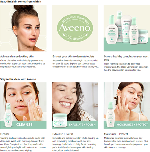 - The Aveeno Clear Complexion collection is designed to clear skin without dulling your natural glow. Each exclusive soy-enriched skincare product, with clinically proven acne medication, clears blemishes and helps reveal your skin's true radiance