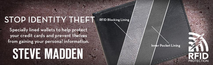 STEVE MADDEN GENUINE LEATHER RFID WALLET - A genuine leather slim compact wallet with RFID technology, featuring 7 credit card pockets, two slip pockets, a mesh ID slot and an emBOSSed STEVE MADDEN logo.