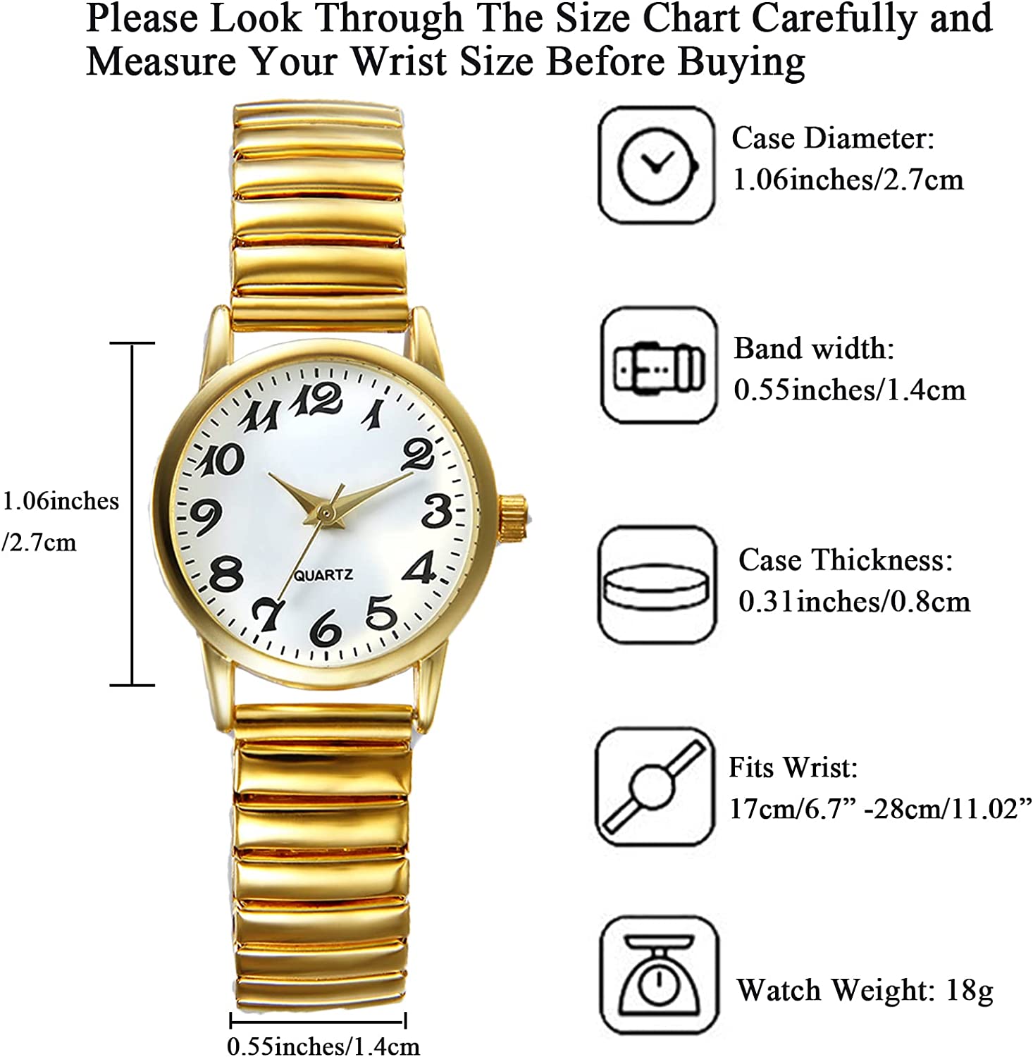 - ?【HIGH QUALITY】Polished Gold-Tone Metal Expansion Band. Stretchable watchband for adjustable size. Easy to put on and take off. Fits wrists size from 17cm-28cm/6.7in-11.02in. Durable premium metal watch case. No more key scratch with the high hardness mineral glass watch face.