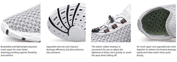 - 3. Open mesh on the upper and hole on the sole provides for superior breathability and quick drying.
