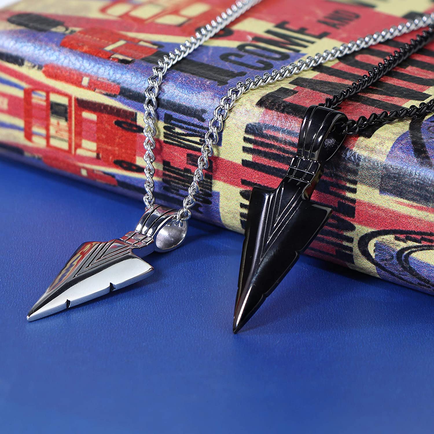 NECKLACE DIMENSION-- 2Pcs Necklace Are In Same Size, Arrowhead Pendant: 0.66*2.2"(17mm*56mm), Come With 2Pcs 24Inches Sturdy Curb Chains, Best Length As Necklace; Color: Silver Tone/Black Tone; Good Weight To Hang On Your Neck, Definitely Would Be Nice For Anyone!