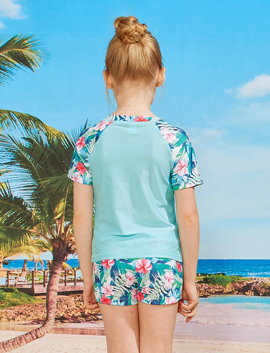 PHIBEE Girls' Short Sleeve Rash Guard Set UPF 50+ Sun Protection Two-Piece Swimwear