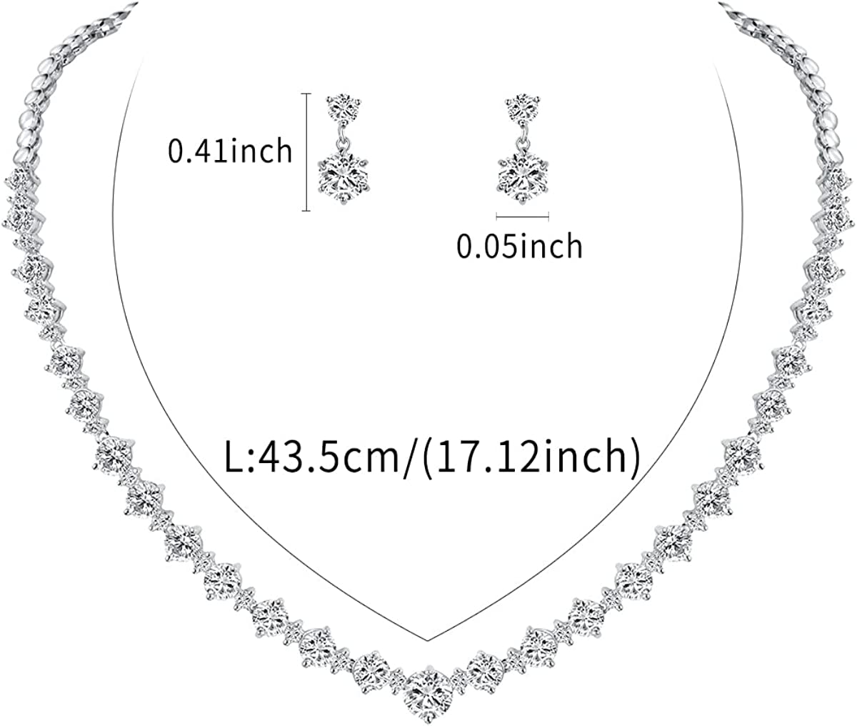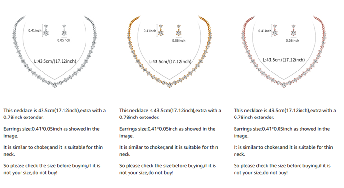 Necklace length:17.12 inch(43.5cm),earrings size:0.41 inch*0.05 inch as showed in the second picture,we aslo add a 0.78inch extender,be sure to measure your neck size before buying,maybe it will be small or large for you!!!