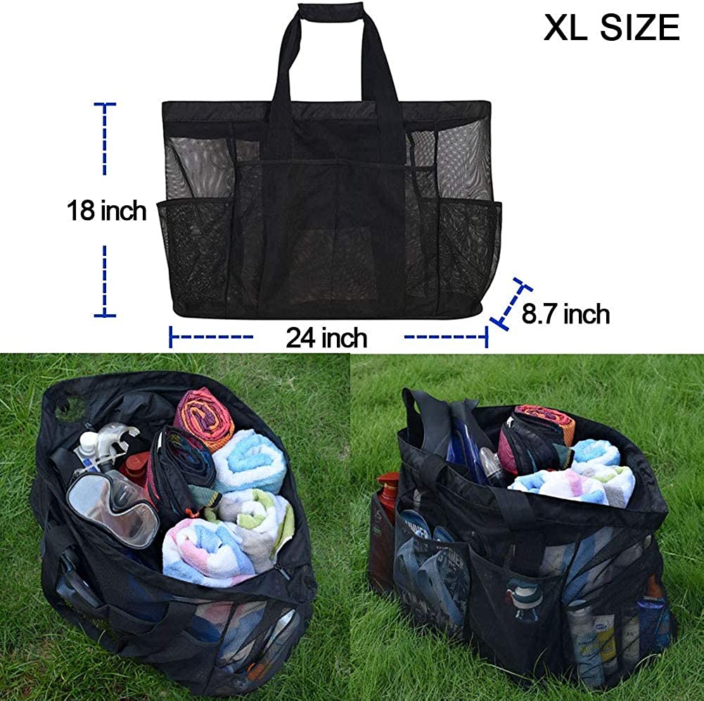 • 【 WITH MORE EXTRA POCKETS 】 - Our black mesh beach bag with 4 outside pockets and 1 inside zippered pocket. 4 deep outside pockets for your extra stuff like water shoes, water bottles... The 1 inside zippered pocket for your valuables like phone, wallet and key...