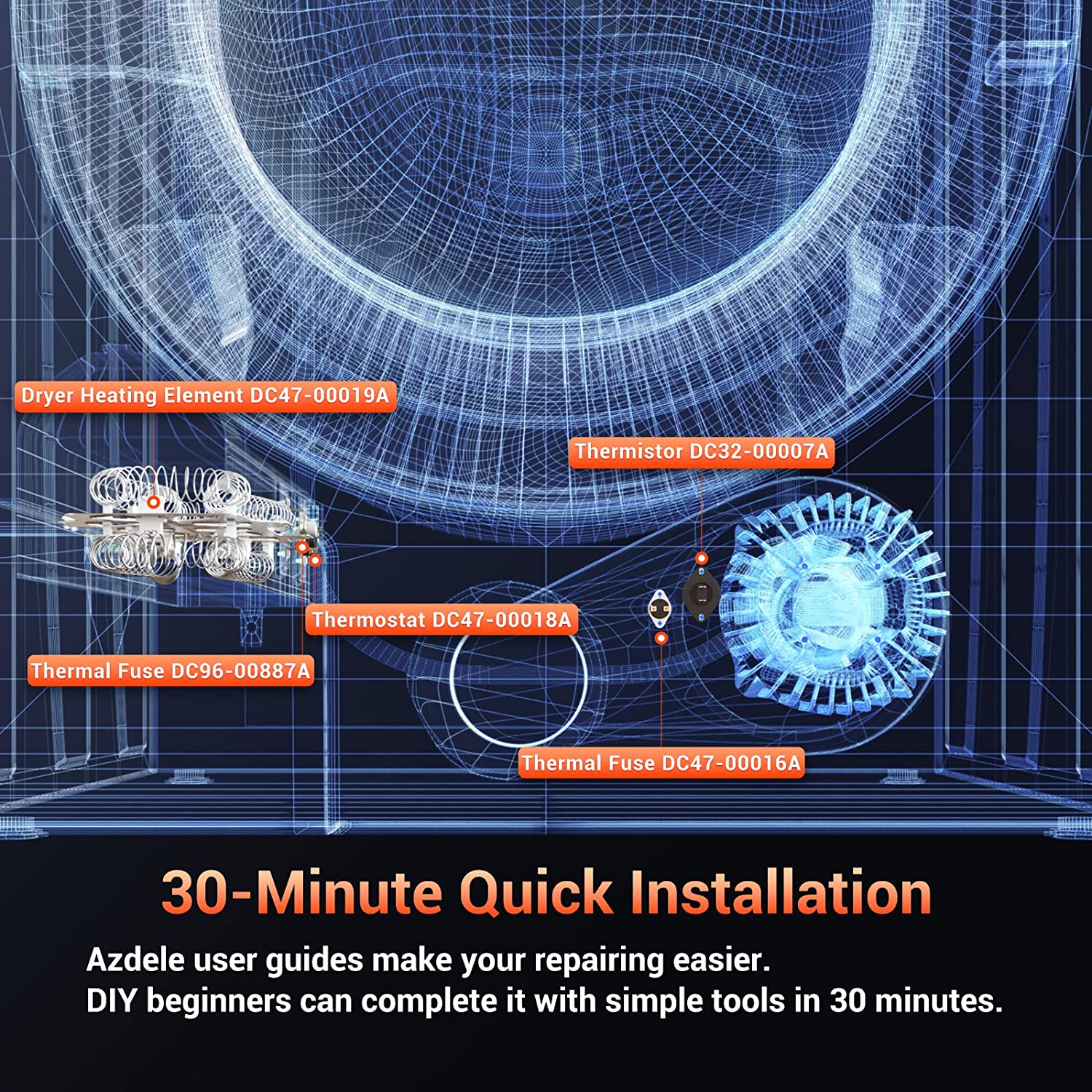 - Professional Customer Service: You will get 1 x DC47-00019A heater element, 1 x DC47-00018A thermostat , 1 x DC47-00016A thermal fuse, 1 x DC32-00007A thermistor and 1 x DC96-00887C thermal fuse. We offer an unconditional 30-day money-back guarantee and a 1-year warranty. If you need any assistance, please contact our 24-hour online service team. Azdele continually provides the ultimate shopping experience for all customers.