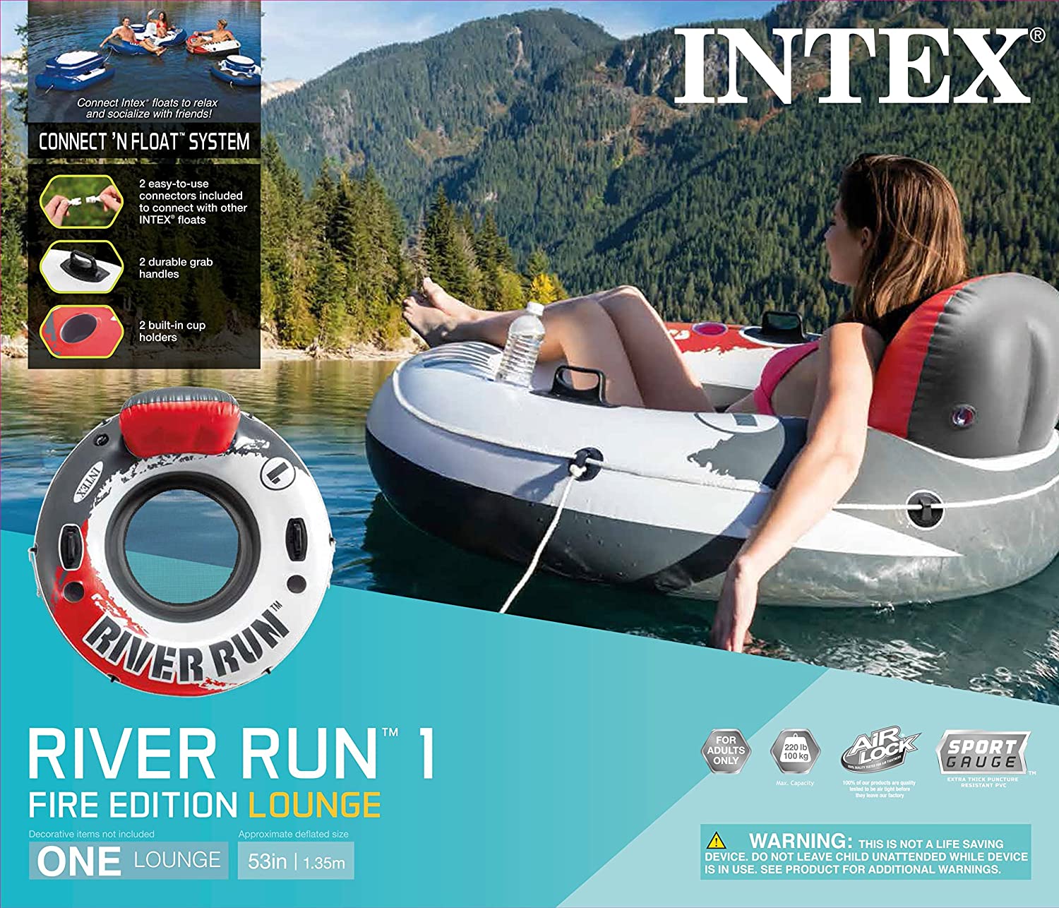 The Intex® River Run inflatable tube is designed to fit an adult and it's perfect for tubing down the river, in the lake, or in the pool. The River Run™ tube is designed for high-performance fun. The bottom of the tube has a mesh layer where the water keeps you cool in the sun. The cup holders and backrest are added comforts on the water. The 18-gauge (0.46mm) vinyl material is durable and cool to the touch.