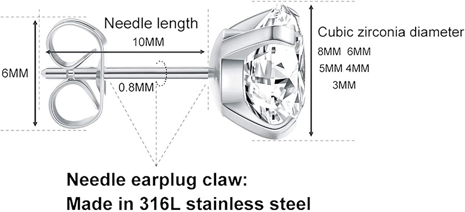 - SET OF 5 PAIRS - Package includes 5 pairs of stud earrings in 5 sizes, 3mm/4mm/5mm/6mm/8mm. Gauge Size: 20G =0.8mm, pin size: 10 mm. The butterfly buckle add extra protection for you.
