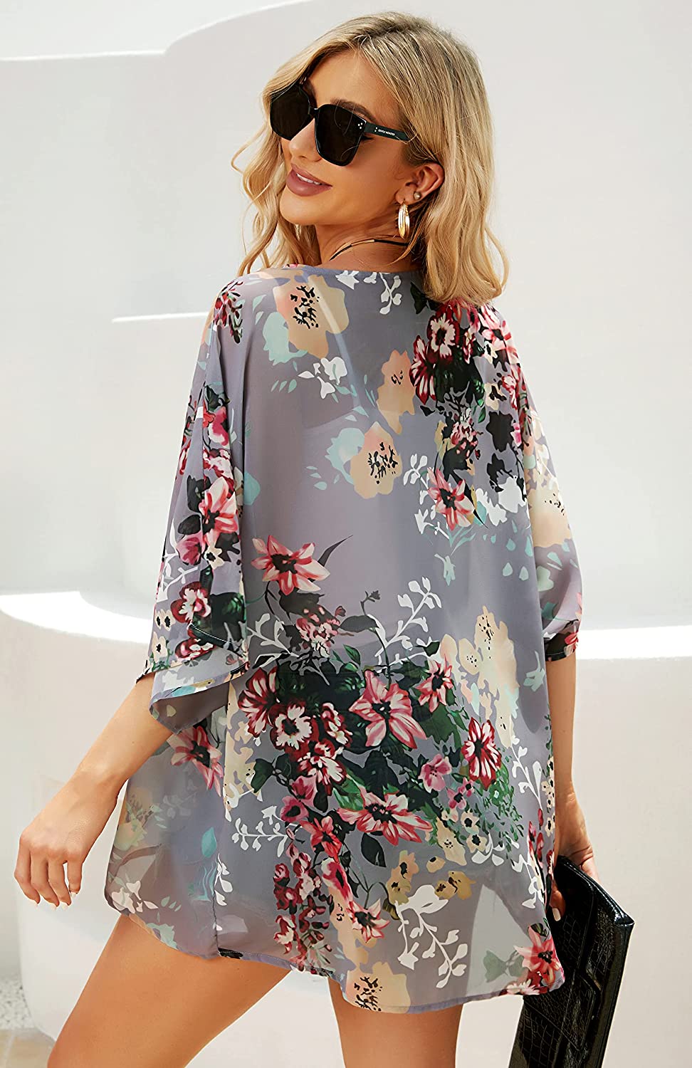Women's Floral Print Puff Sleeve Kimono Cardigan Loose Cover Up Casual Blouse Tops