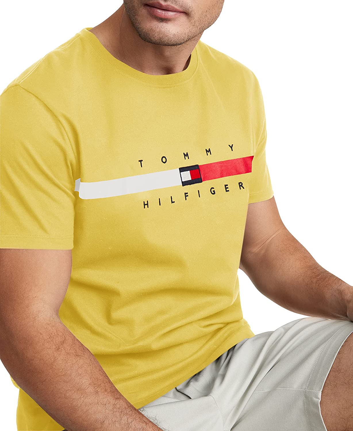All year, keep it clean and classic with this tee from Tommy Hilfiger. T shirt for men with crew neck collar design. Men's t shirt with embroidered flag logo at sleeve. Tommy Tee with a graphic design on front. Short sleeve tee in soft cotton material.