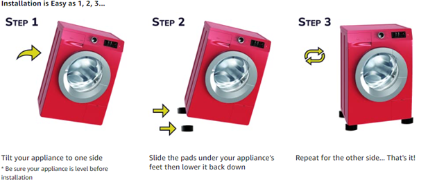 - Quick & Easy DIY Install in Minutes Without Tools - Simply tilt your appliance to one side, slide a VibraShield pad under each lifted foot, lower your appliance's feet onto the pads, then repeat for the other side. Installs quickly in a few easy steps without tools or professional installation. Before installing, ensure your appliance is level