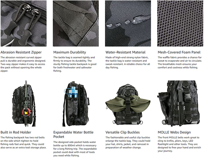 • 【Water-Resistant & Durable】Made of high density strong nylon fabrics with extra firm stitches, the water-resistant fishing backpack is durable for long-term use. With our abrasion resistant materials, you can take this fishing tackle bag to any freshwater or saltwater fishing trips.