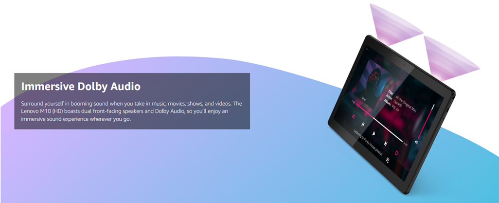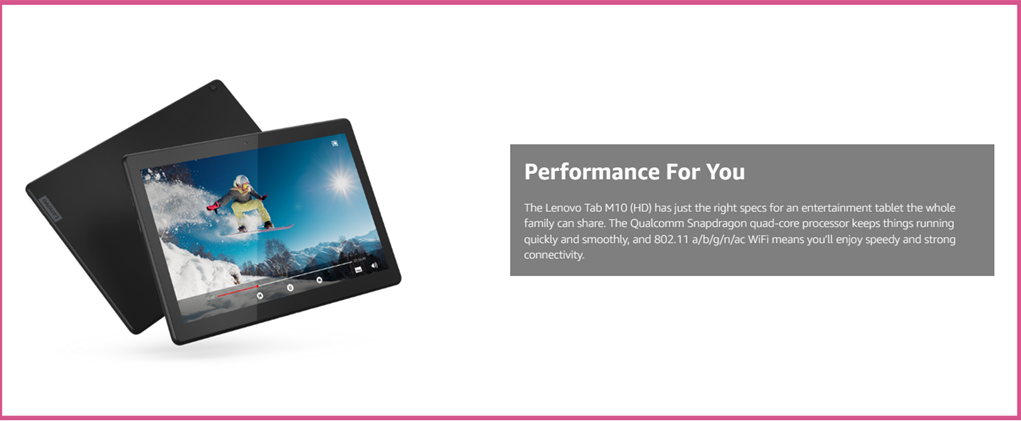 • The Lenovo Tab M10 (HD) is one impressive family tablet; It is packed with powerful Qualcomm Snapdragon 429, quad core, 2.0 GHz and supports fast connection with true 2.4 GHz/5 GHz WiFi Dual bands