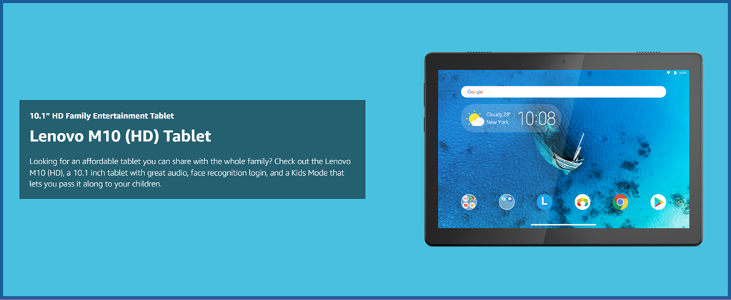 The Lenovo Tab M10 (HD) is one impressive Android™ tablet – and made for the whole family! This impressive 10-inch tablet features an HD screen and two front speakers with Dolbsy Audio™ (plus a 3.5 mm audio jack) to make streaming videos, games, and other applications come to life. Packed with a powerful Qualcomm® Snapdragon™ 429, quad-core, 2.0GHz processor, the Tab M10 offers 32GB memory and microSD™ card slot to add more. It supports fast connection with true 2.4 GHz/5 GHz Wi-Fi dual bands (WLAN 802.11a/b/g/n/ac), Bluetooth® 4.2, and a Micro USB port. Plus, you can put your mind at ease with the special kid's mode, containing custom content and protection features so your children can use this Android™ tablet without the worry.Thin, light, and ready to go when you are, the Tab M10 (HD) delivers up to 8 hours of video playback time on the 1280x800 resolution 10.1" HD screen. Front and rear cameras let you take photos and connect with family and friends no matter where you are. And with facial recognition technology, you can unlock your device quickly and conveniently.