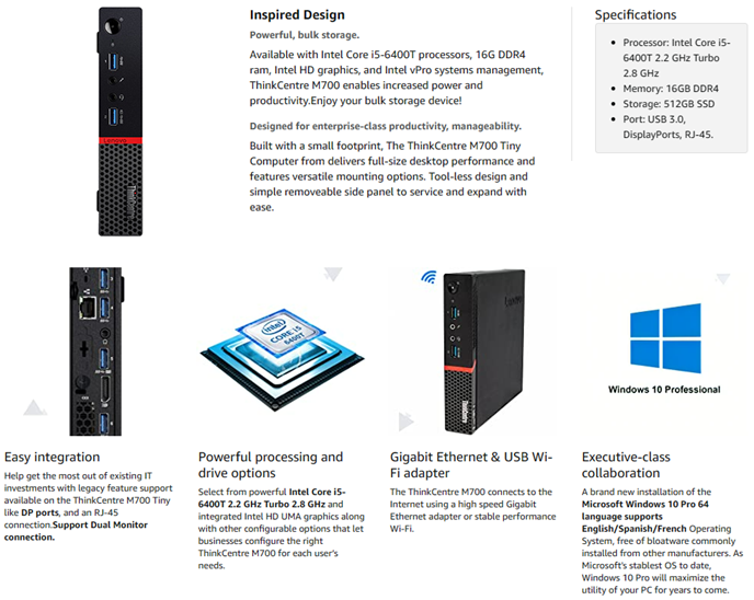 - Lenovo Think Center M700 Tiny Desktop PC, Intel Quad Core I5-6400T 2.2GHz up to 2.8G, 16GB Memory,512GB SSD