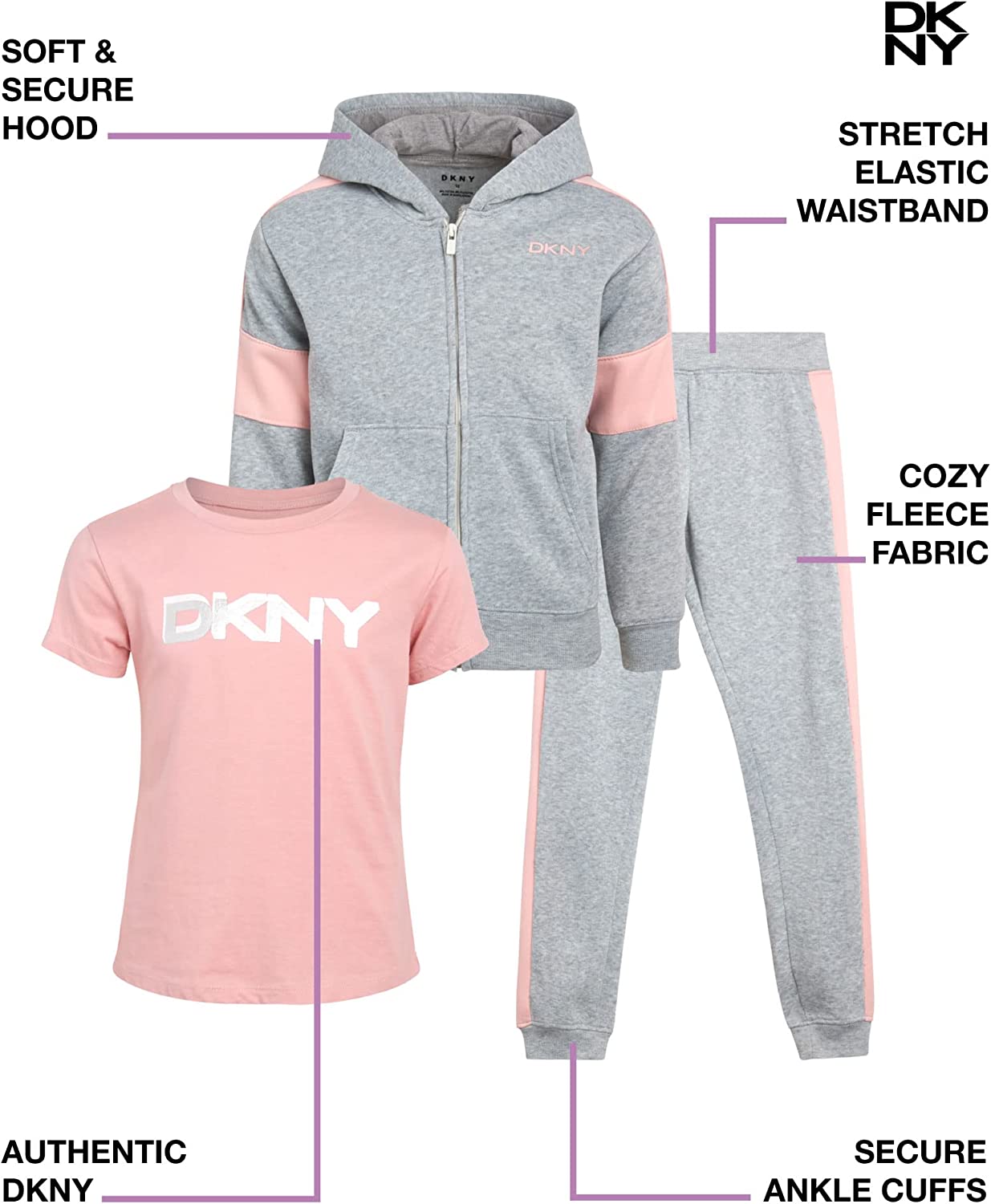 DKNY Girls' 3-Piece Fleece Pant Set will make any girl, from toddler to tween, happy to add this to her collection. She'll be stylish and feel great when she's at school or spending the day with family. This comfy top, bottom and jacket is a great outfit for any occasion.