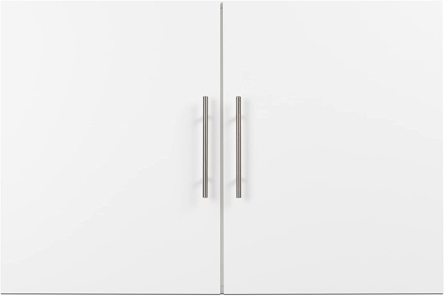 WALL MOUNTED OVERHEAD CUPBOARD: Secures onto most standard walls and features 2 clean line doors and 2 adjustable shelves with a central divider in a crisp white laminate finish with satin nickel-finished metal handles