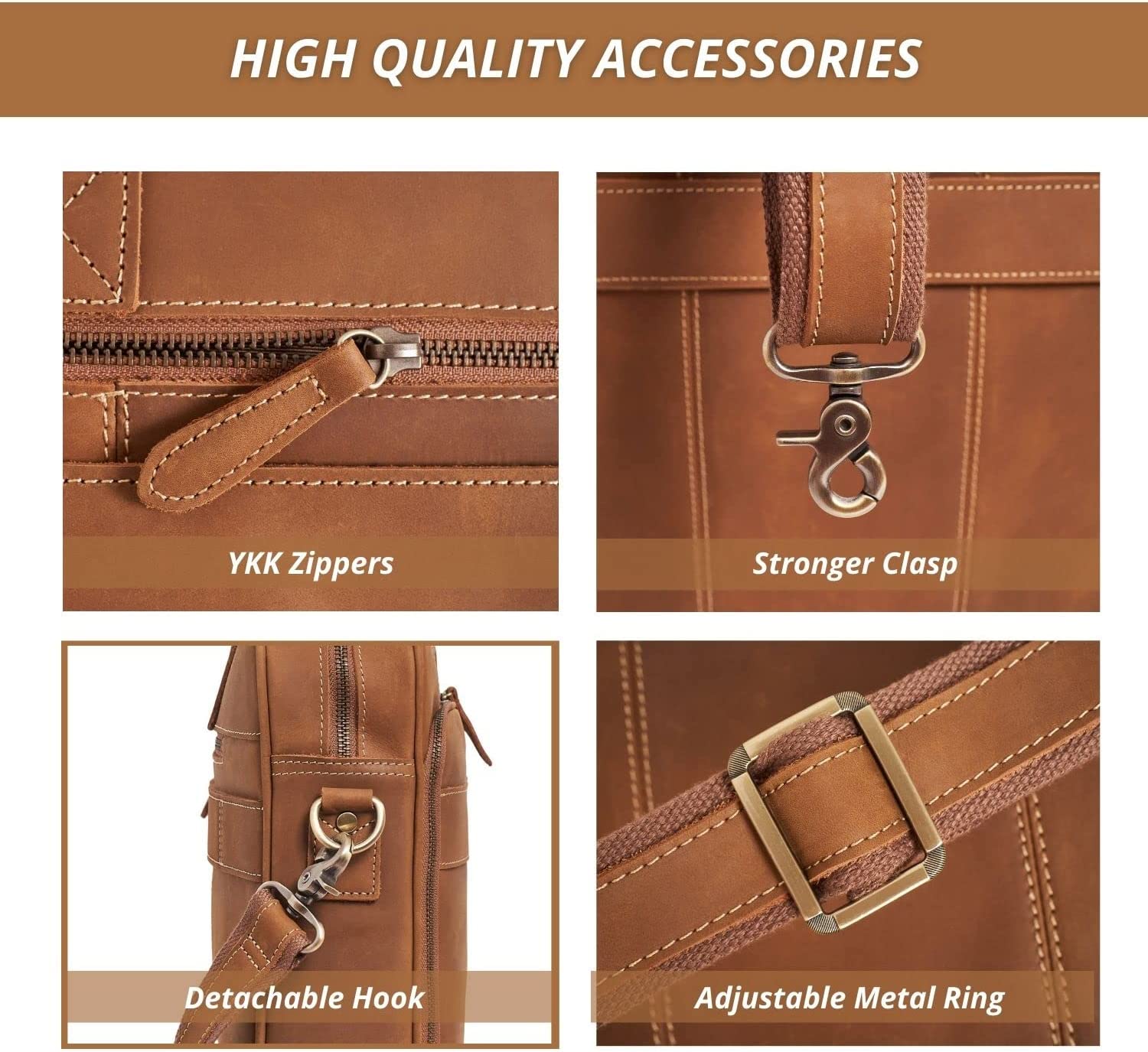 QUALITY CRAFTSMANSHIP - The executive leather briefcase for men is constructed with fine materials and expert craftsmanship. YKK zippers, solid antique brass hardware, precision stitching with heavy bonded thread, and a superb upgraded internal lining design. An office bag for men that will withstand many years of commuting.