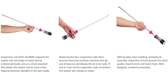 - 【Overview】Suspension rod DC97-05280W supports the washer tub and keeps it stable during unbalanced loads. acts as a shock absorber that allows the washer tub to move while helping minimize vibration in the spin mode. Replacing the four suspension rods often corrects Samsung washing machines that go out of balance and display the dc error code. If one or more of the suspension rods are broken, the washer will vibrate or shake.