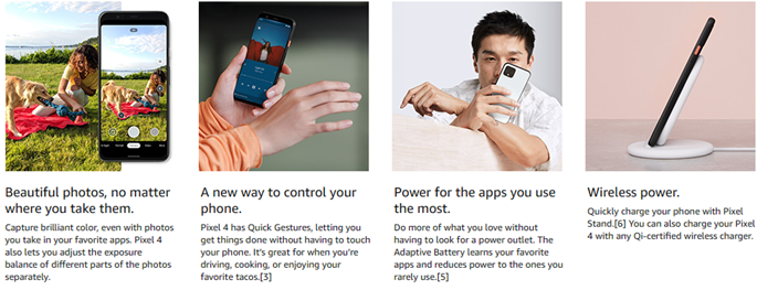 Pixel 4 is the phone Made the Google way. So it’s built around the helpful Google software you know and love, that’s always getting better. 1) See G.Co/Pixel/astrophotography to Learn more about astrophotography on Pixel 4. 2) Us only. English only. 3) Coming soon to Japan. Motion sense functional in the us, Canada, Singapore, Australia, Taiwan, and most European countries. Not all phone features are controlled by motion sense. 4) Us & Canada only. English only. 5) Approximate battery life based on a mix of talk, data, standby, mobile Hotspot and use of other features, with motion sense off and always on display off. Use of motion sense, an Active display or data usage will decrease battery life. Pixel 4 and 4 XL testing conducted in Mountain View, California in August 2019 on pre-production hardware and software. Actual results may vary. 6) Up to 10 W with Pixel 4 and Pixel 4 XL charging with Pixel Stand (Sold Separately). actual results may vary.