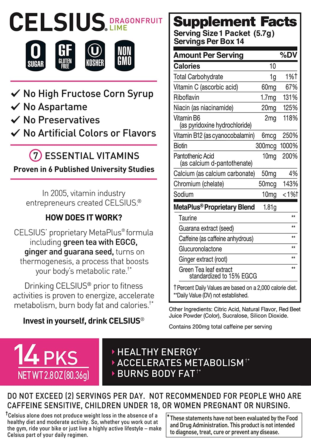 CELSIUS On-the-Go Powder Stick, Combo Pack of Dragonfruit Lime and Cranberry Lemon, 28 Piece Assortment