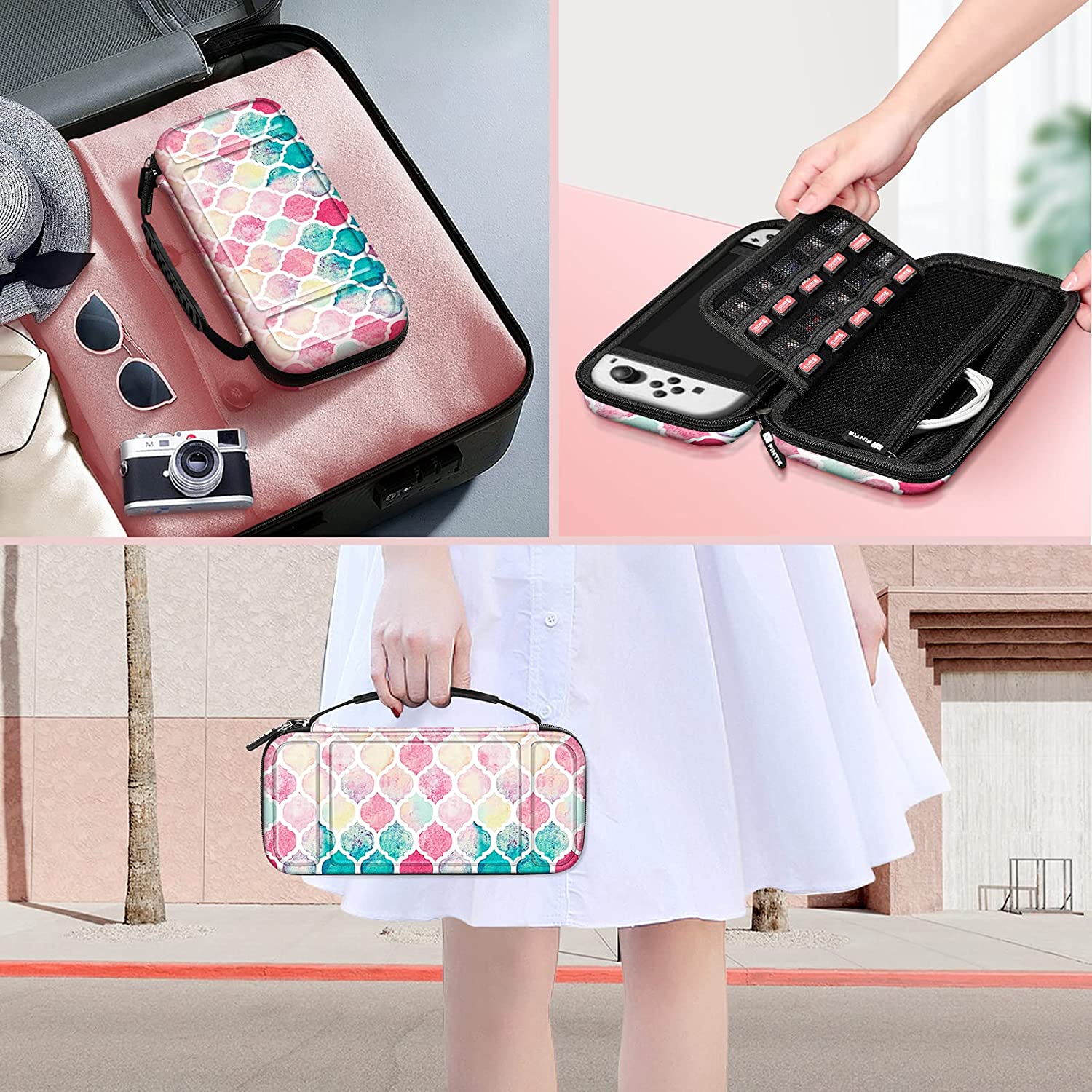 - Designed to make your Nintendo Switch / Switch OLED Model console and accessories more portable & travel-friendly. This carrying case fits Switch Console with both Joy-Con attached on.