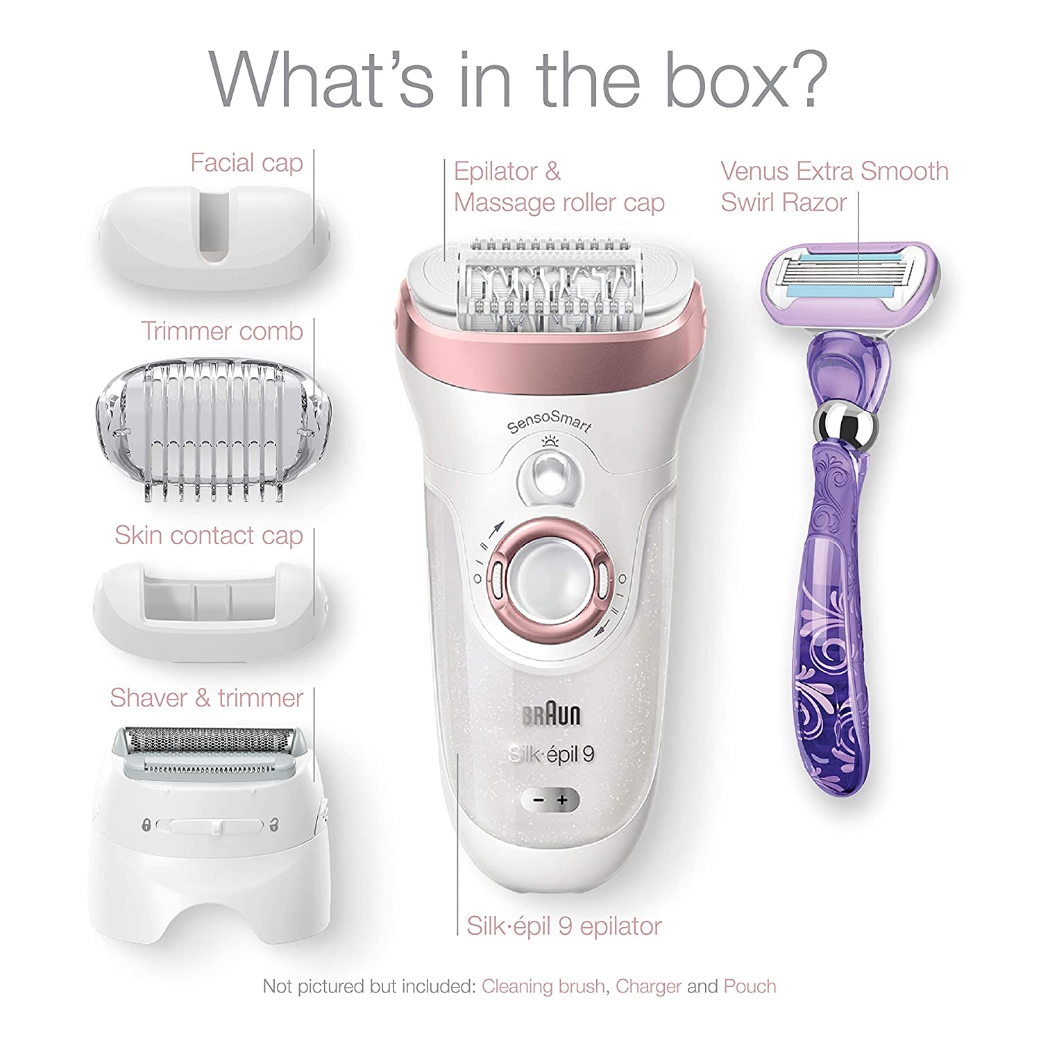 The Braun Silk-epil 9-870 with a wide head for ultra fast epilation. Enjoy weeks of salon-smooth skin thanks to micro-grip technology and a 40% wider head that removes hairs as short as 0.5mm. The shaver and trimmer head gives you added options for sensitive areas and the epilator for Women is 100% waterproof, which means you can epilate in the bath or shower for a painless experience. Box includes: 1 x epilator 1 x shaver head 1 x trimmer head 1 x pouch 1 x Venus razor 1 x cleaning brush 1 x charger