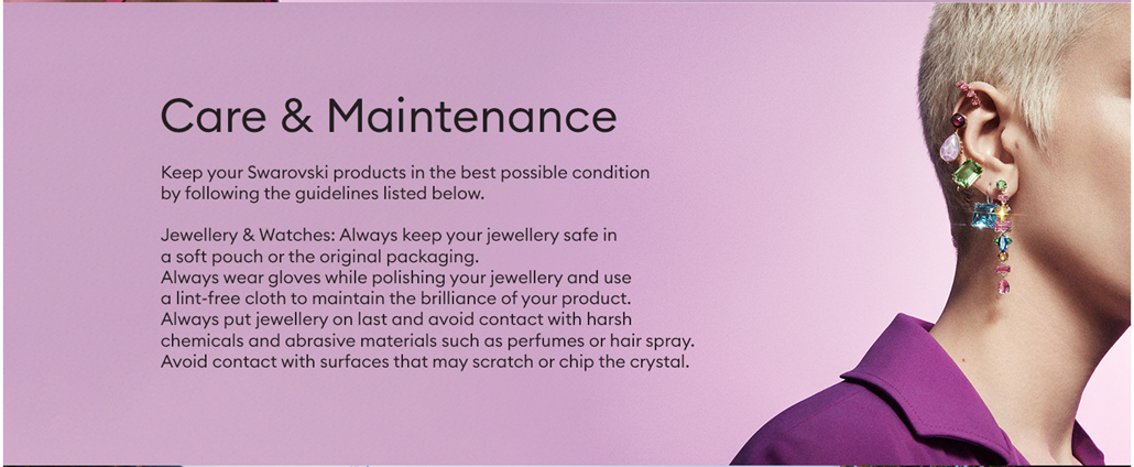 Designed to last: Swarovski jewelry will maintain its brilliance over time when simple care practices are observed; remove before contact with water, lotions or perfumes to extend your jewelry's life