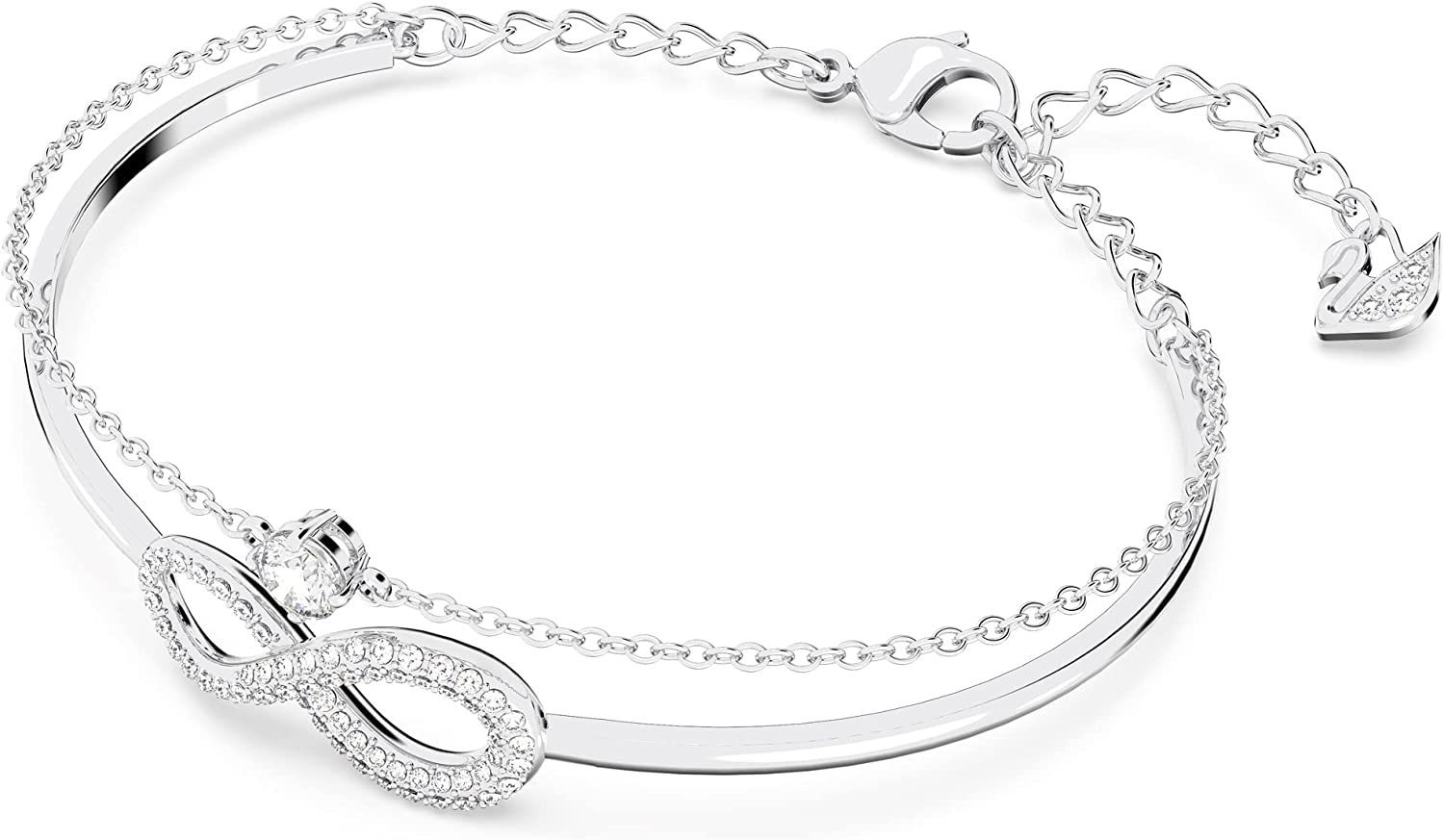 Items delivered: 1 x Swarovski Infinity bangle bracelet for women, 2 1/4 / 1 3/4 inches rhodium plated band and chain, white crystal infinity symbol and clasp closure, with Swarovski bracelet box