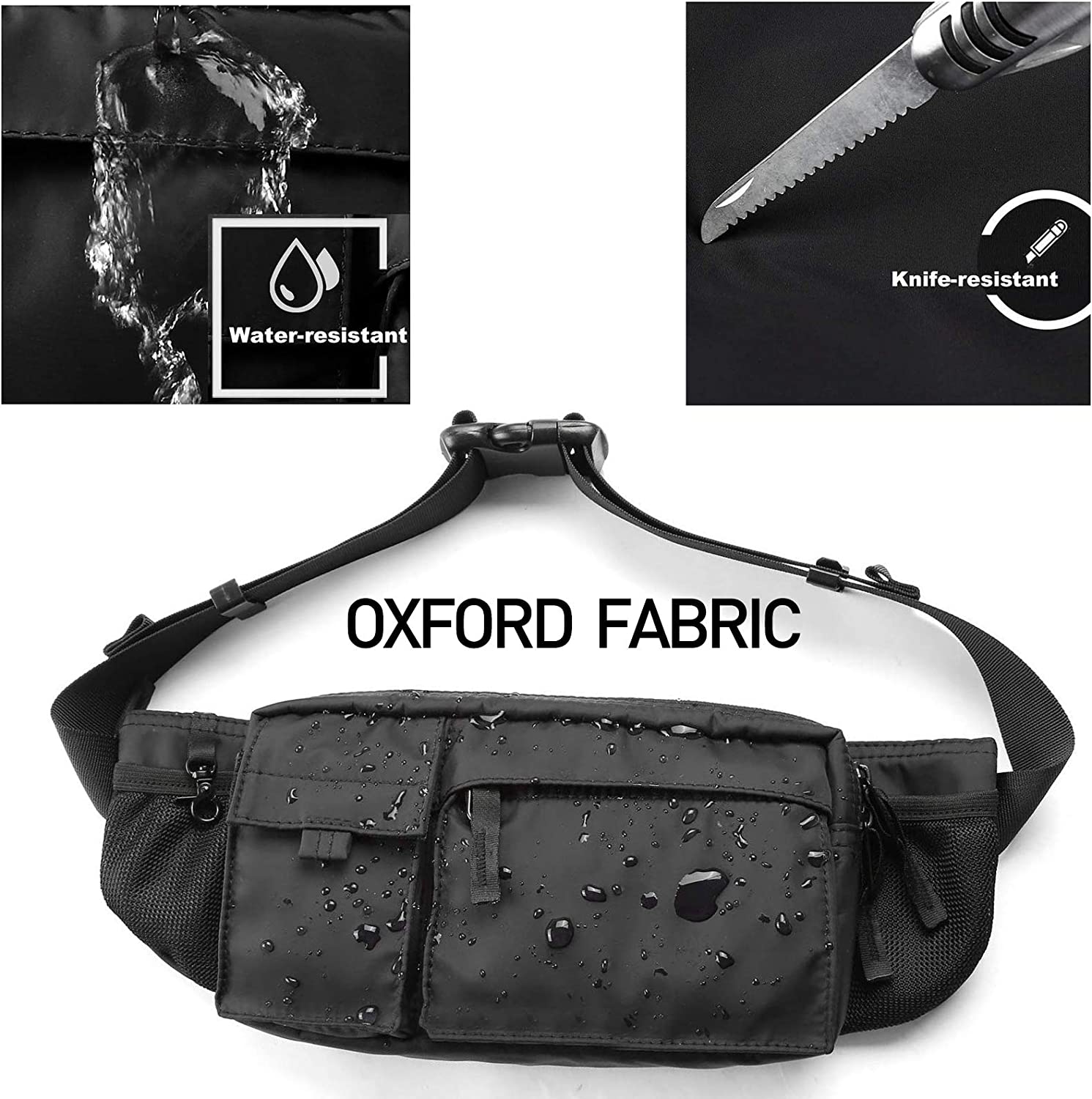 Premium Material - black waterproof fanny pack belt bag is made of nylon with excellent air permeability. wear-resistant, durable and waterproof material & linings, with exquisite overall craftsmanship, cleanly finished seams and made of strong 900D oxford waterproof material. durable zippered pockets for cell phone, wallet key etc., notice: water resistant for drops or splashes, but do not take it into the water.