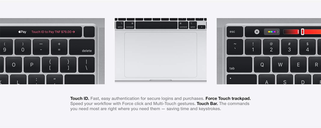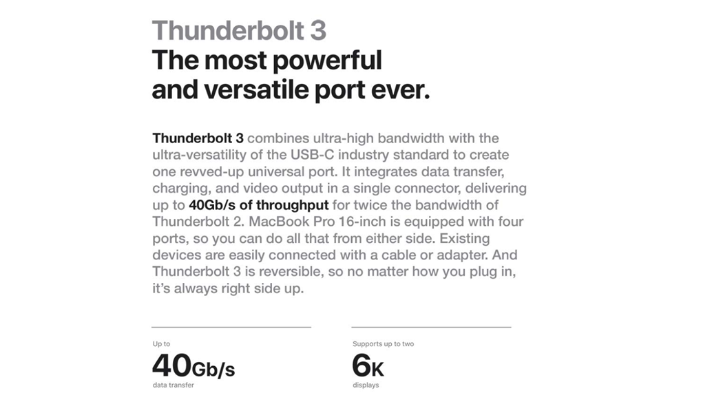 | Charging and Expansion | Four Thunderbolt 3 (USB-C) ports with support for: Charging, DisplayPort, Thunderbolt (up to 40 Gbps), USB 3.1 Gen 2 (up to 10 Gbps) |