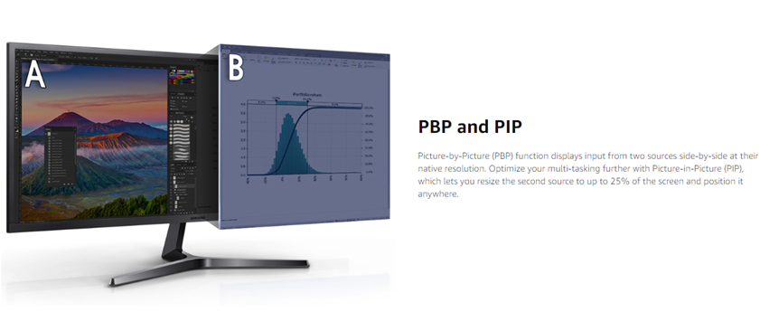 - PERFECT FOR DUAL MONITOR USAGE with powerful multitasking split screen features – PBP/PIP and easy to use embedded split screen software