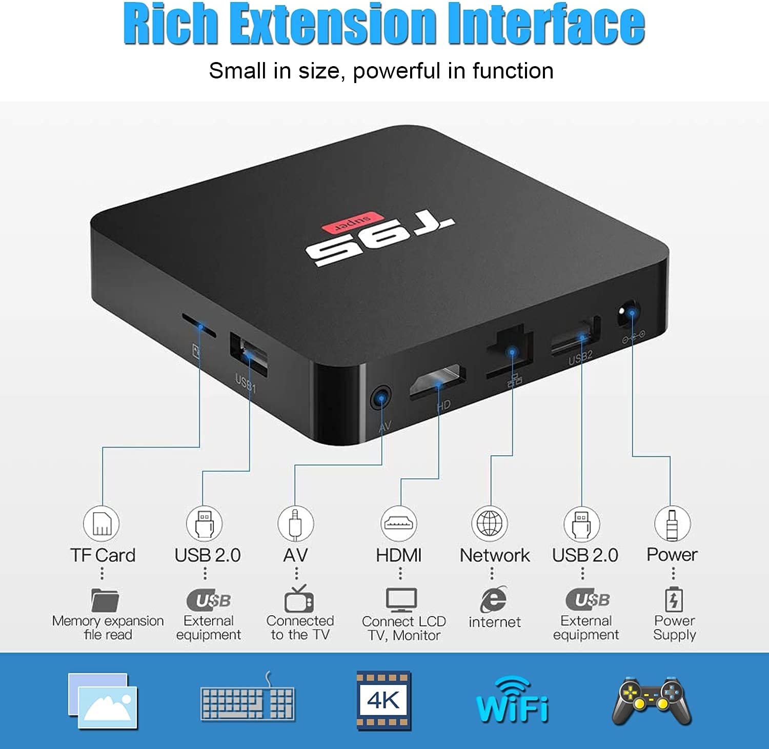 【Easy to Use】The T95 Super Android TV box is easy to use. It can be used with old TV or even in any country, only need an HDMI cable and connect to the Internet/Wi-Fi. It supports changing wallpaper and updating the firmware online.
