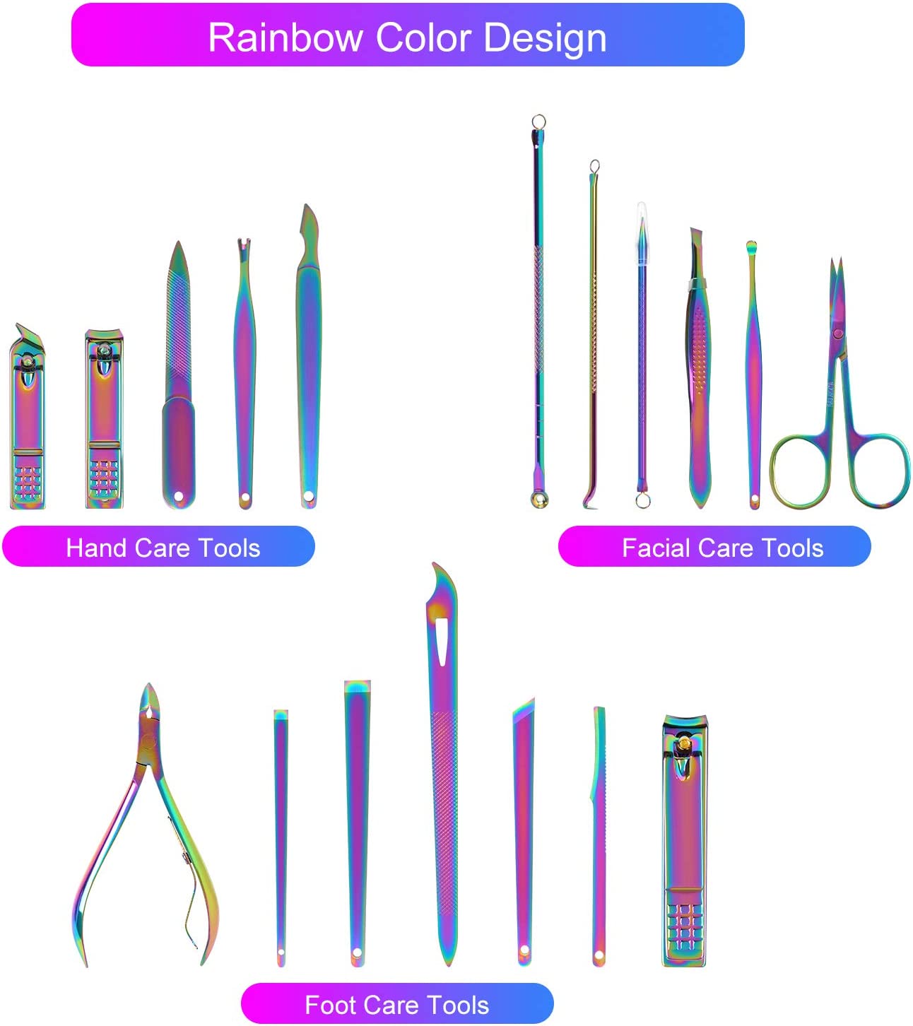 - 【2020 New Unique Design】: Our rainbow manicure kits, its highlight is rainbow tools with a rainbow PU leather texture case, feel comfortable, fashion and practical. This will be the first time on the market in 2020. You will be amazing about it. Beautiful leather covers will never go out of style, have a comfortable feel and are easy to trim. It will be an excellent quality gift for christmas, birthday, anniversary and marriage.