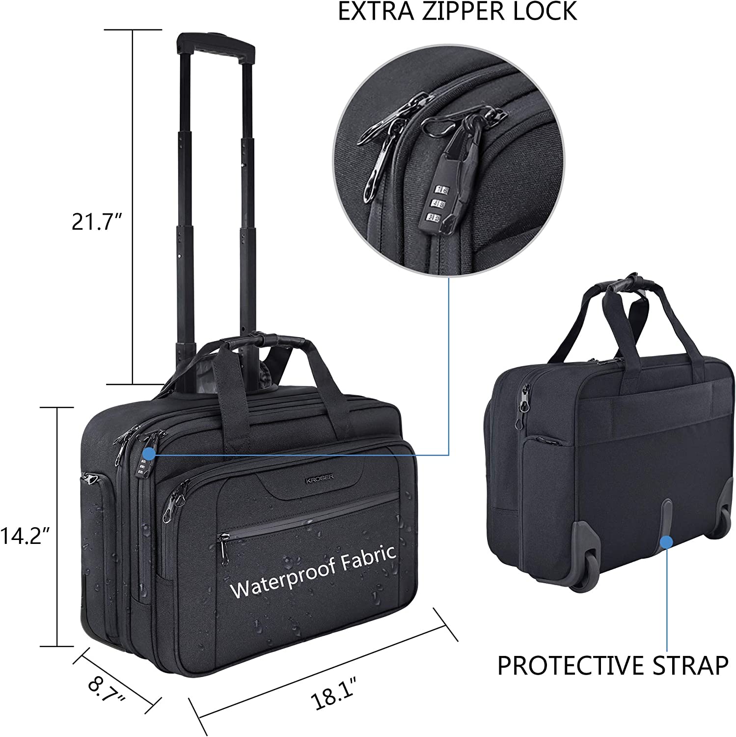 - MATERIAL: The Rolling laptop bag is made of durable and high-quality waterproof fabric. Dimensions: 18.1”x 14.2” x 8.7”; Weight: 6.33 LBS. Maximum length of the telescoping handle: 21.7 inch
