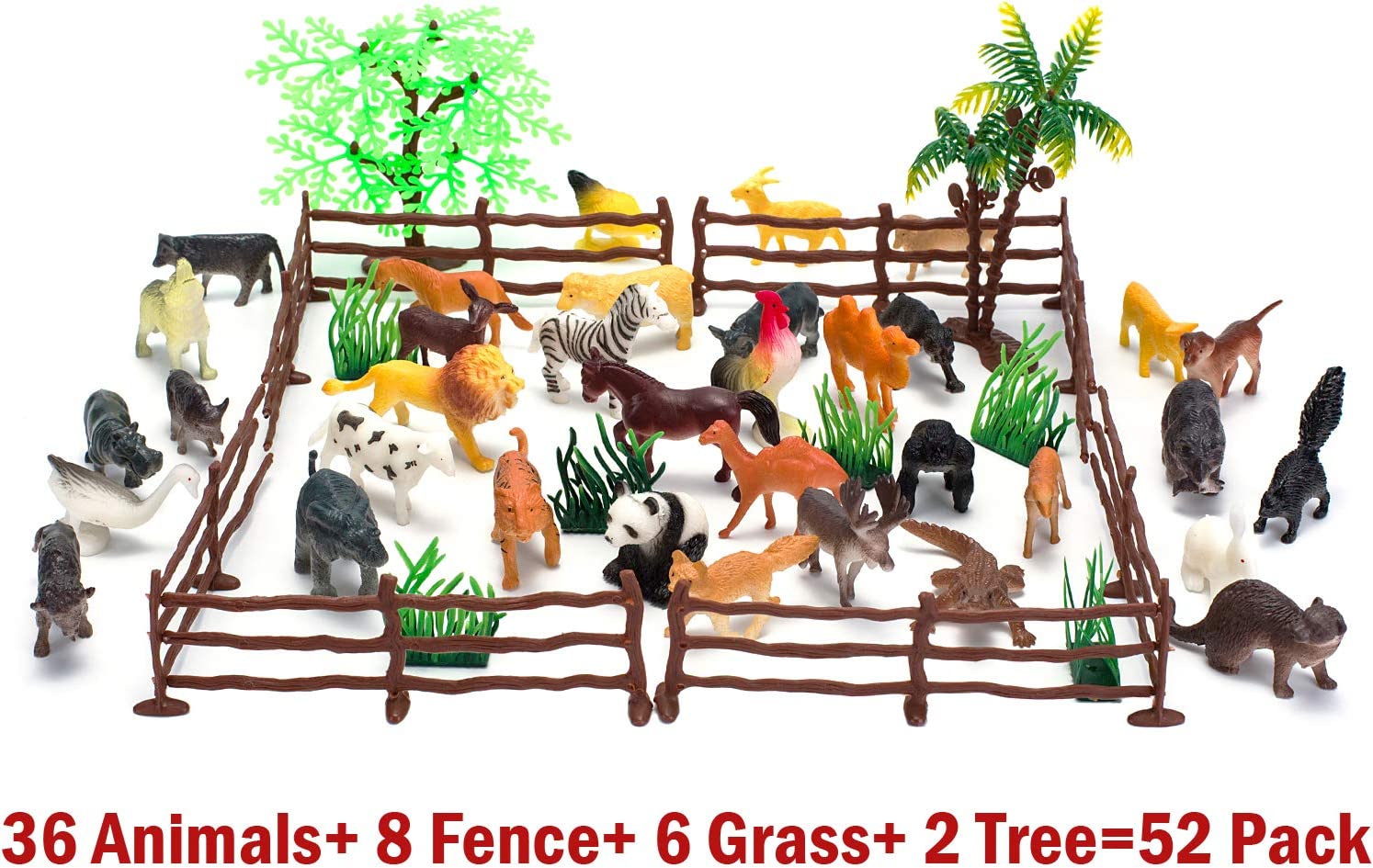 - GREAT VALUE PACKAGE: 52 Pieces assorted mini plastic safari animal figures, animal figurines measure about 2-3 inch, including 36 no repeats animals, 1 Trees, 1 Coconut tree, 6 Grass and 8 Fences.
