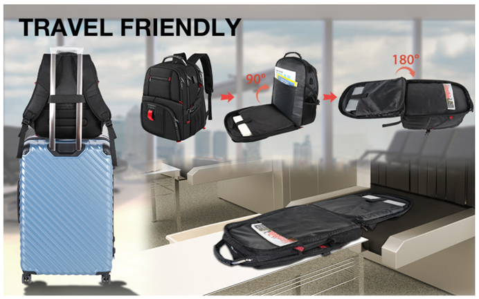 TSA Approve & Multipurpose: At checkpoints, the large travel backpack can be freely unfolded 90-180 degrees, allowing you to quickly pass through airport security and keep things tidy, exclusively designed for airplane travel. A luggage strap allows the traveling backpack to fit on the suitcase, great for international plane travel and day trips