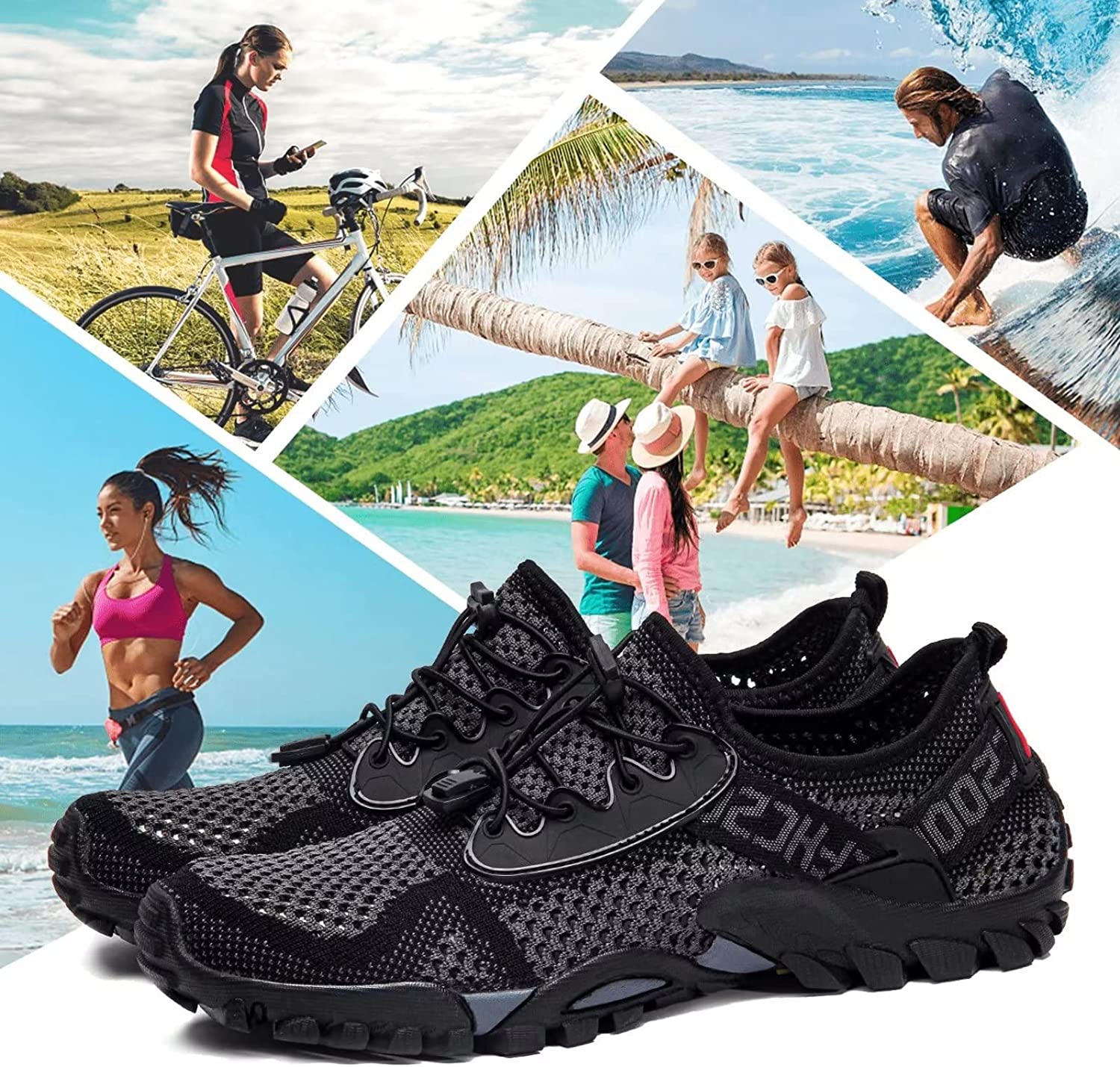 - QUICK DRYING AND COMFY: Water shoes with open mesh upper promises quick drying and breath-ability, let each step cool, dry and comfy.