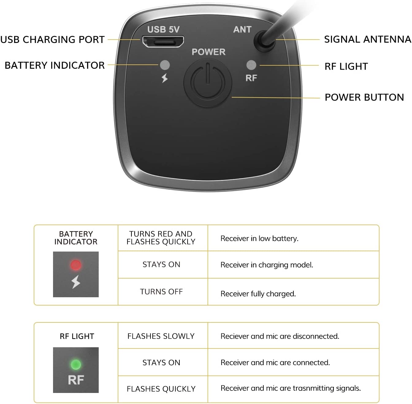 Rechargeable Battery: The rechargeable and portable receiver only needs to charge for about 2-3 hours and can be used up to 6 hours. Both mic and receiver are made of rugged metal, which has strong impact and corrosion resistance.