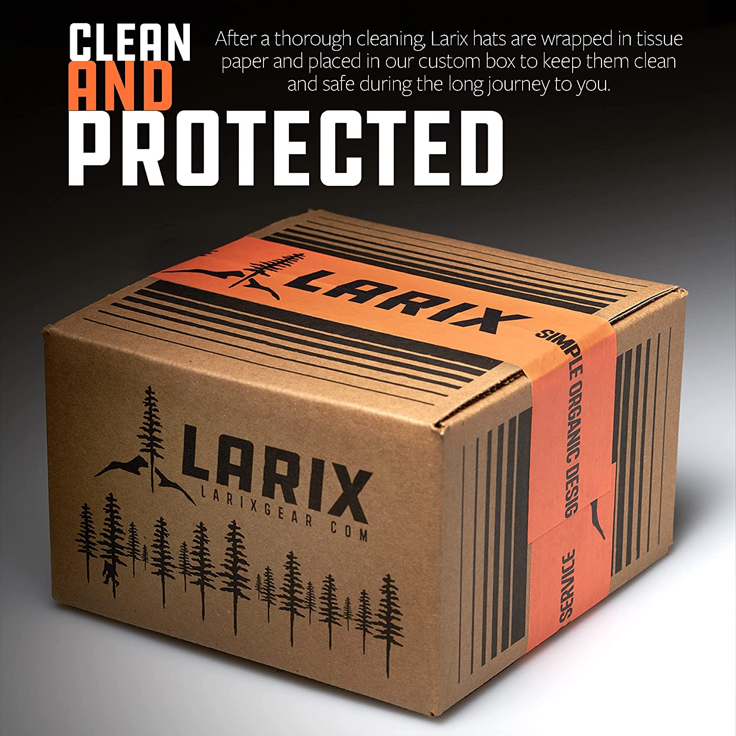 - SHIPPED IN BOX : After your hat has been cleaned and prepped we wrap your Larix hat in tissue paper before placing it in our custom box to keep it clean and safe during its long journey to you. IF YOUR HAT DOESN'T ARRIVE IN A BOX PLEASE REACH OUT TO US DIRECTLY TO LET US KNOW. You will immediately understand the level of care and craftsmanship put into your Larix hat upon receiving and opening your box.