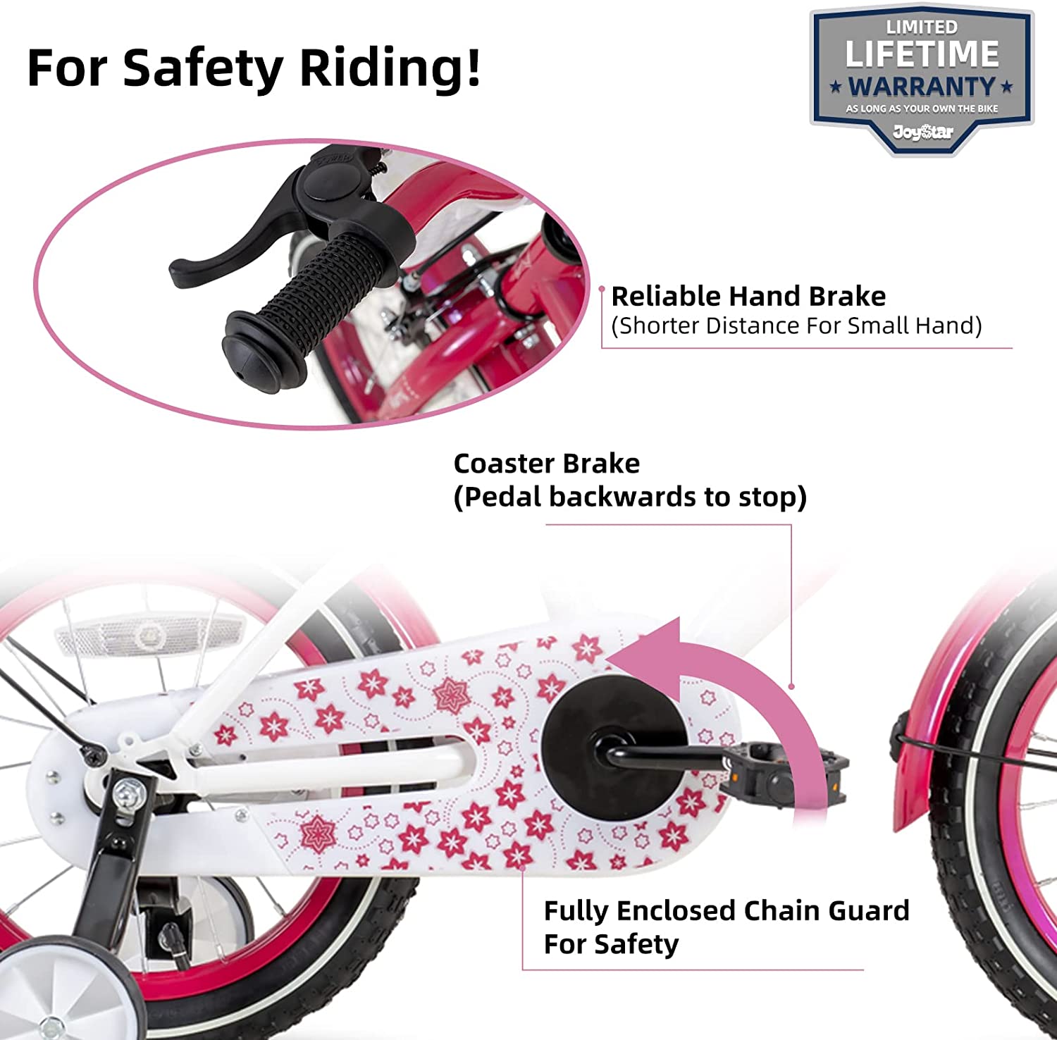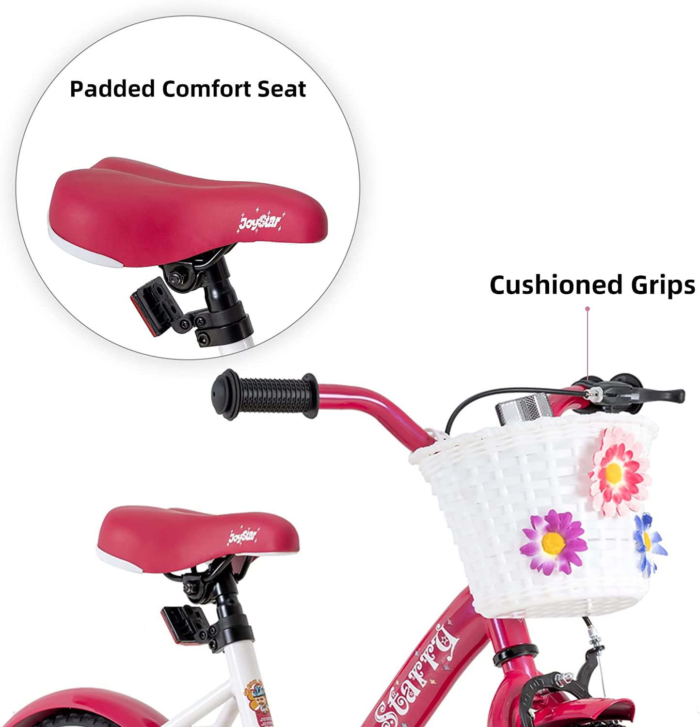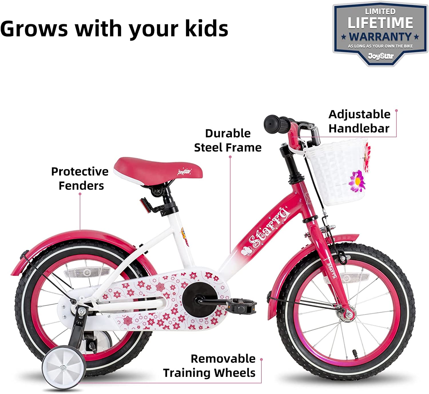 • ✔Designed for Kids - JOYSTAR Starry 14inch Girls bikes are designed for children ages 3-5 years old or 35-47inches tall. The Starry features a durable and light steel frame, easy-to-steer handlebars, and an adjustable seat. The Starry is perfect for riding to the park or riding on the sidewalk around the neighborhood.