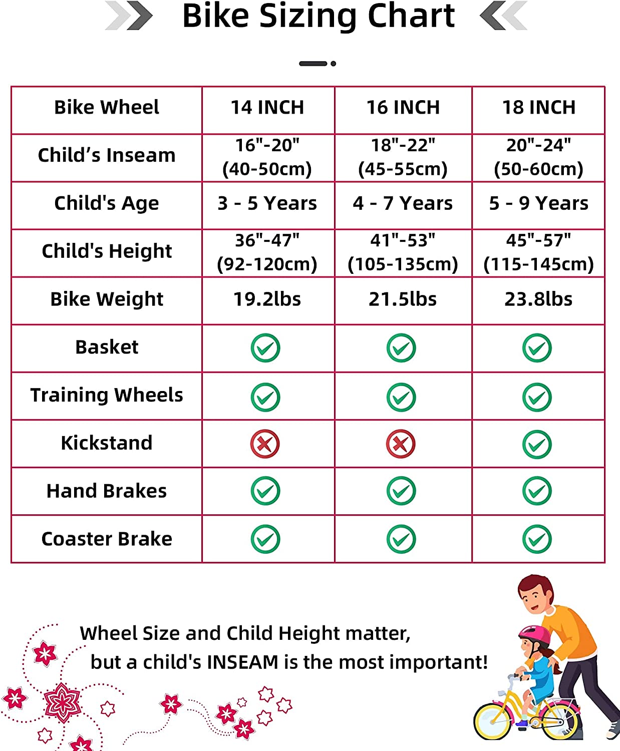 • ✔ALWAYS ON YOUR SIDE - 14 inch bike is suitable for 3-5 years old (35"-47") girls; 16 inch bike is suitable for 4-7 years (41"-53") girls; 18in bike is suitable for 5-8 years (45"-57"). Adult assembly is required. The bike comes with 85% assembled body and the basic assembly tools, timely customer service and also limited lifetime warranty.