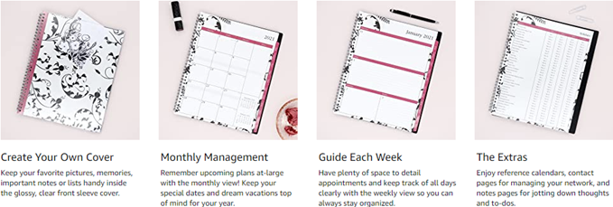 Get ahead with elegant florals and refined design! This stylish CYO (create your own) cover planner will keep you organized everywhere you go. Add in your favorite photos, sentiments, notes or memories to the clear cover pocket, and keep organized with dated weekly and monthly pages inside for easy scheduling. Fresh page designs add a touch of style and offer plenty of room for all of your important information. High quality white paper provides clean writing space for jotting down your appointments, to-dos and reminders. Durable coated tabbed dividers are long lasting and make accessing information a breeze. Use this dated planner to stay on track for appointments, and to jot down notes and ideas in one place. Premium quality covers and twin-wire binding. Mix and match with other Analeis Collection planning products from Blue Sky to organize your daily life. Blue Sky creates modern and sophisticated organizational planners and calendars to fit the scheduling needs of busy people - whether business professionals, college students, teachers, or anyone with appointments to make note of. Keep your life organized with our full line of products including desk pad calendars, wirebound tabbed weekly and monthly planners with contacts and notes pages to accommodate your scheduling needs, and laminated two-sided wall calendars, all in a variety of colors and patterns to suit your lifestyle and personality.